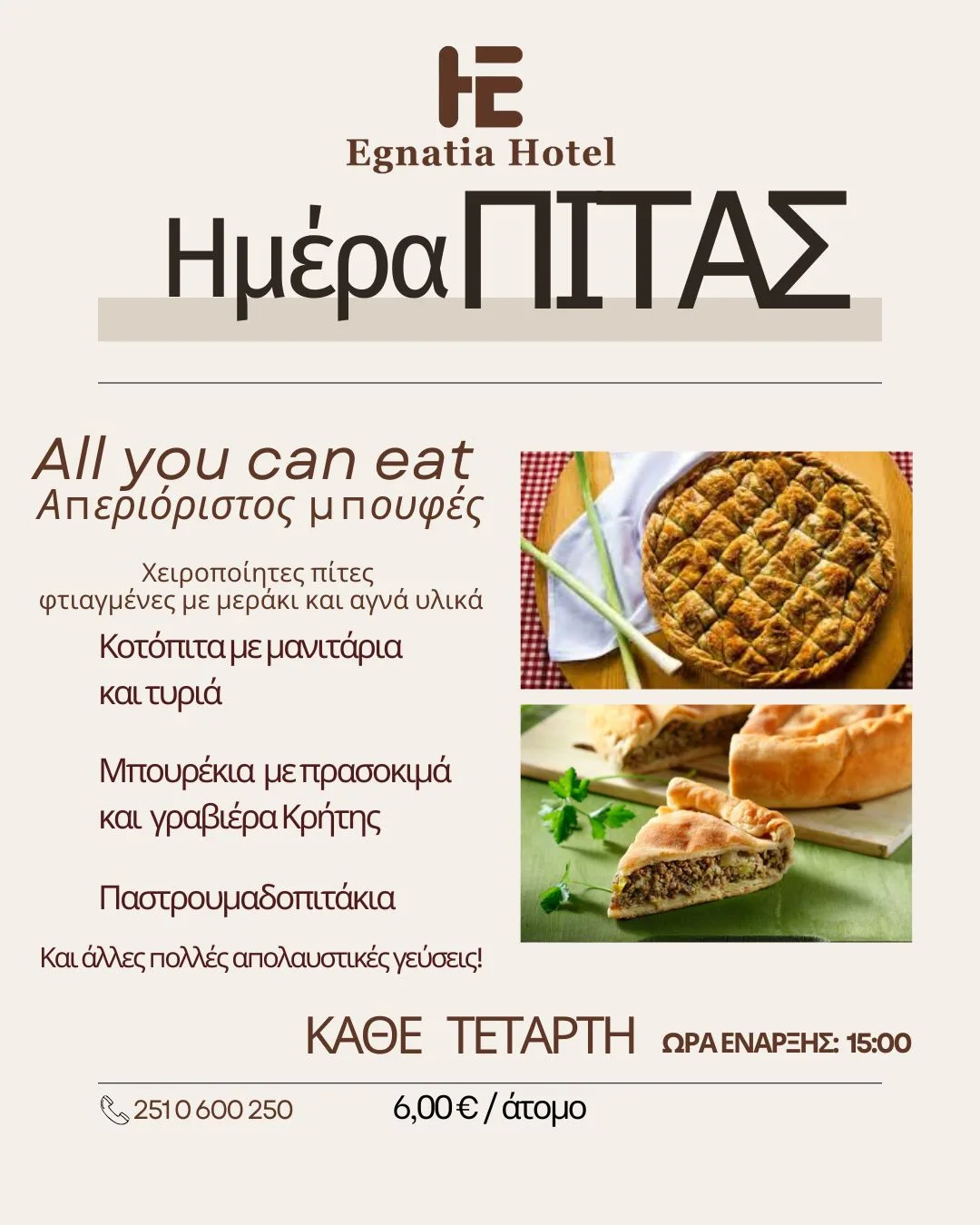 Η Ημέρα Πίτας είναι γεγονός. Από Τετάρτη 04 Φεβρουαρίου και κάθε Τετάρτη μετά τις 15:00, σας περιμένουμε στο ξενοδοχείο μας για να απολαύσετε χειροποίητες, παραδοσιακές πίτες, φτιαγμένες με αγάπη.